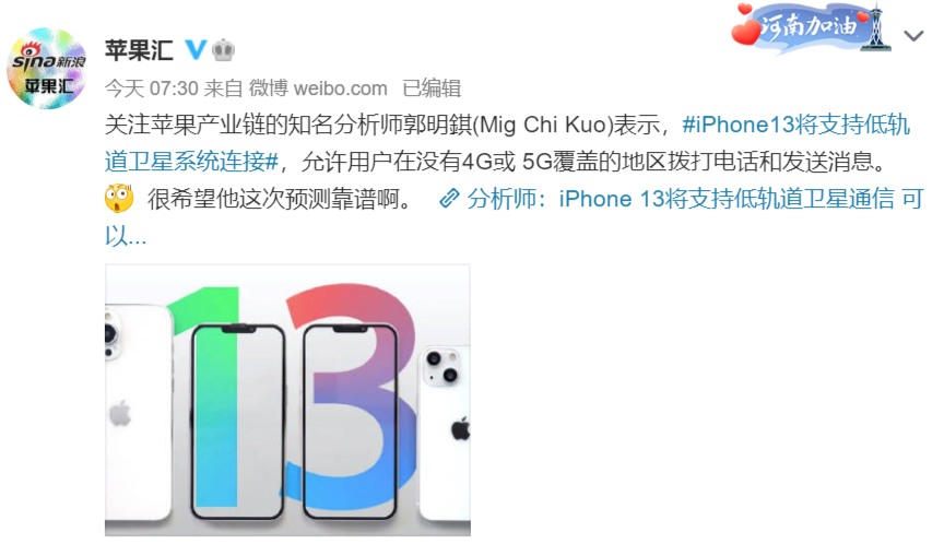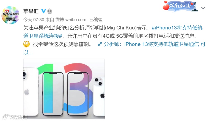 据博主@苹果汇 最新消息称,“关注苹果产业链的知名分析师郭明錤(Mig Chi Kuo)表示,iPhone13将支持低轨道卫星系统连接,允许用户在没有4G或5G覆盖的地区拨打电话和发送消息”。