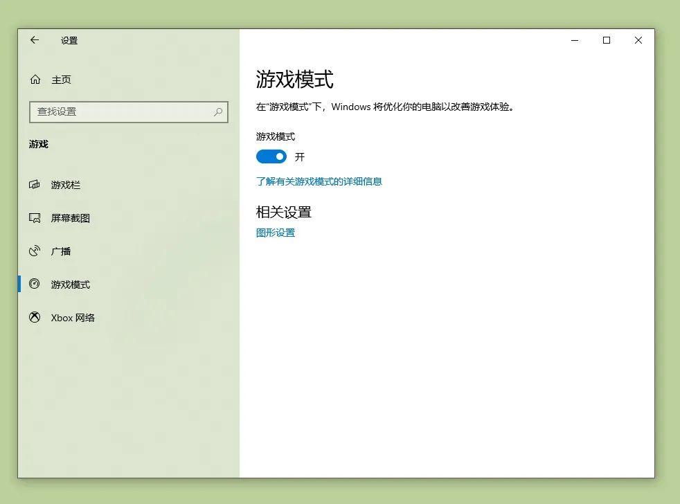 打开设置界面,选择【游戏】-【游戏模式】,将其按钮开启即可。