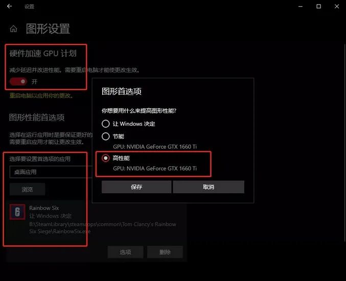 第三步:在图形设置界面中,打开【硬件加速GPU计划】的按钮,然后选择对应的游戏,在【图形首选项】中勾选【高性能】即可。