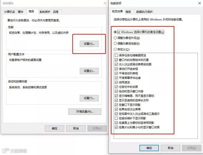 第二步:在系统界面中,点击【关于】-【高级系统设置】-【高级】-【性能】-【设置】。
