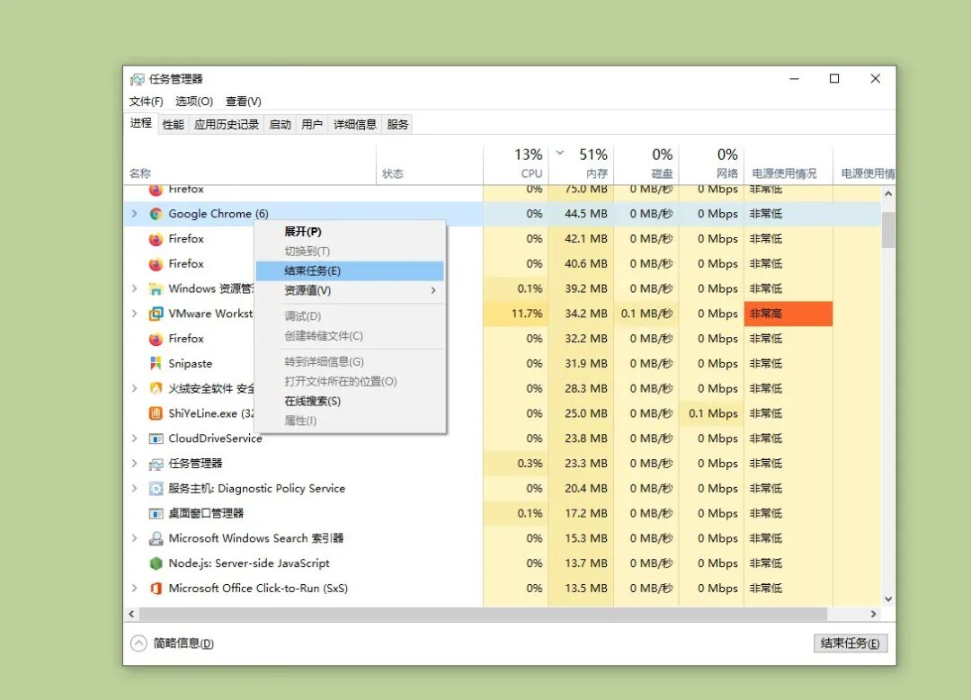 同时按下【Ctrl+Shift+Esc】组合快捷键,打开【任务管理器】。在这里我们会看到后台运行的进程,点击【内存】那一列即可将其变为降序,从大到小显示哪些进程占用的内存比较多。对于不常用的进程,我们右键点击,选择【结束任务】即可。