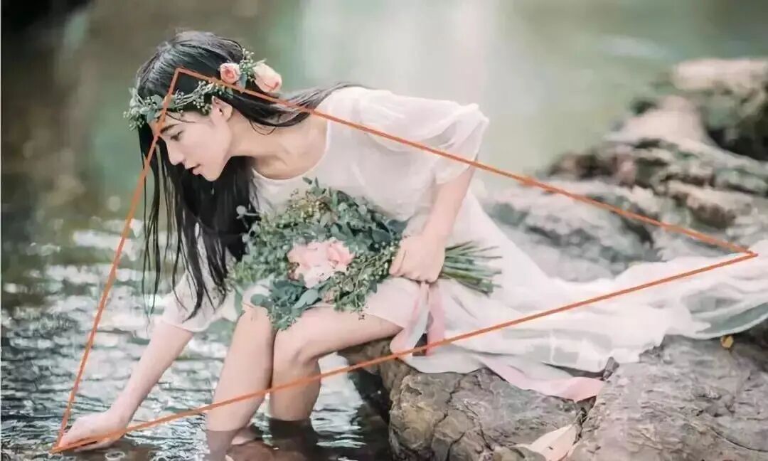 三角形构图是人像摄影中一种典型的构图形式,分为正三角形、倒三角形和斜三角形。拍摄时利用人物主体的肢体或动作姿态来组合构成三角形。这种构图具有一种极强的稳定感和向上的冲击力,人物的脸部通常作为视觉中心通常位于三角形的顶端,是拍人像的最常用构图方式。