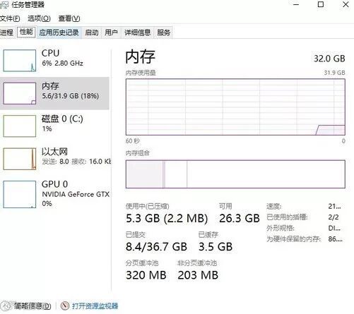 举个简单例子来说,我自己使用的电脑物理内存为32GB,在开了7个网页和一个Word加一个Excel的情况下内存使用率已经达到了5.3GB 18%,要是在物理内存16GB的情况下使用率几乎达到了40%,8GB就更不用说了基本已经卡死,这就是我们常见的内存不足的现象。
