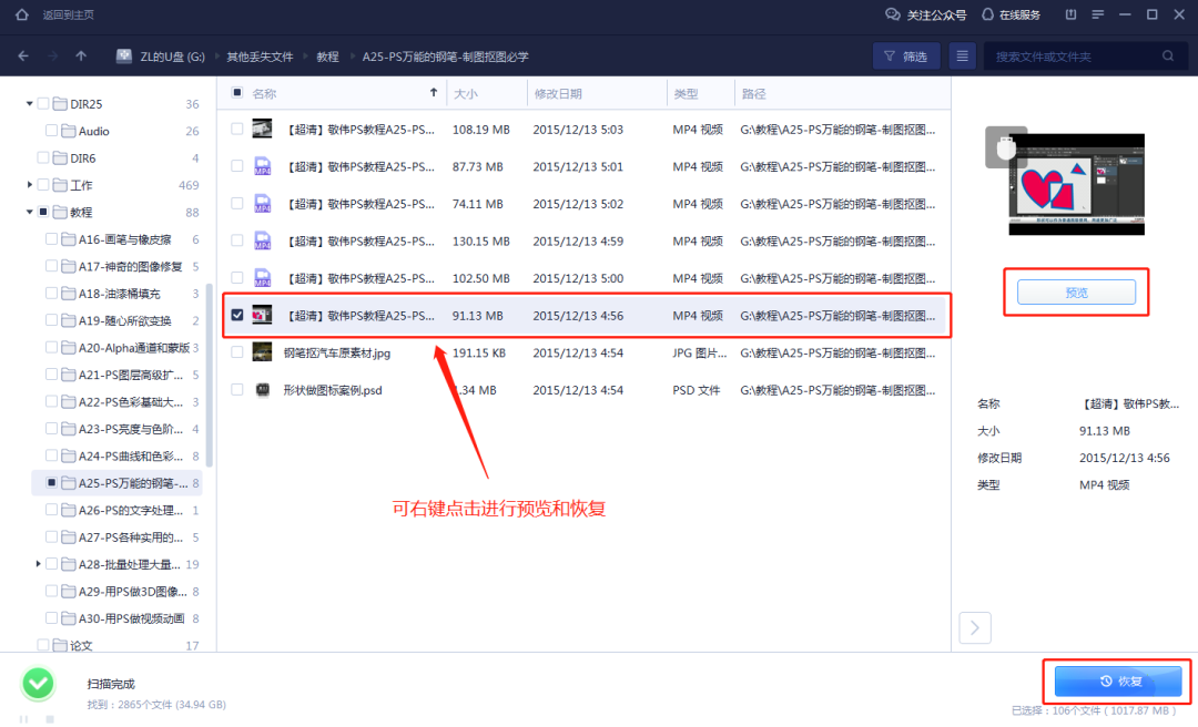 2.扫描完成后可以对找到的数据进行预览。(如果在扫描中途发现丢失文件,可以随时暂停进行恢复。)