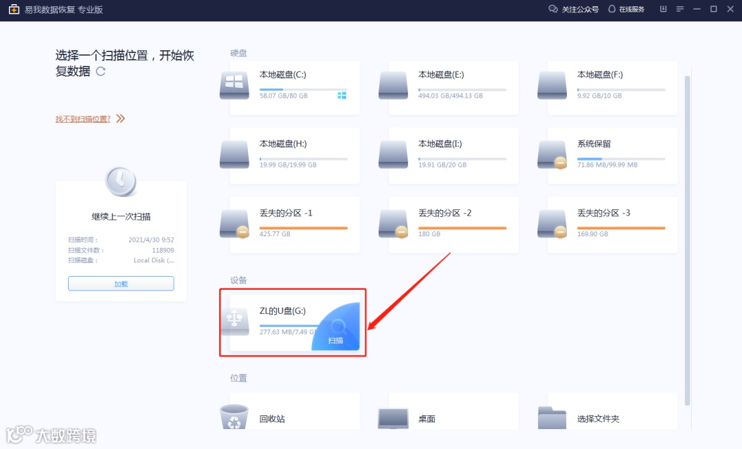 1.在计算机上插入U盘并运行易我数据恢复,点击首页U盘【扫描】开始查找丢失的数据。