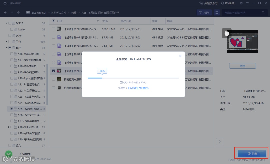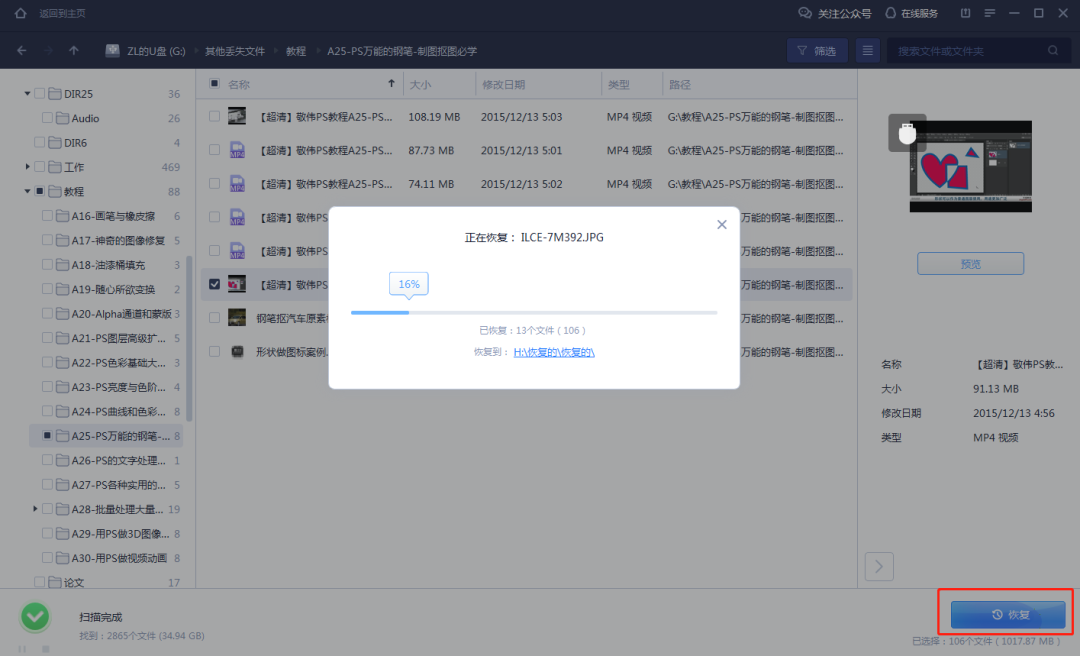 3.预览确定没有问题后,点击恢复即可找回丢失文件。(注意:千万不要将恢复的数据保存到U盘,以免数据损坏!)