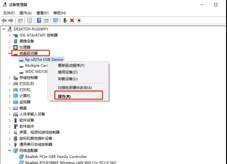2.点击【磁盘驱动器】,右键选中U盘设备,并点击【属性】窗口。