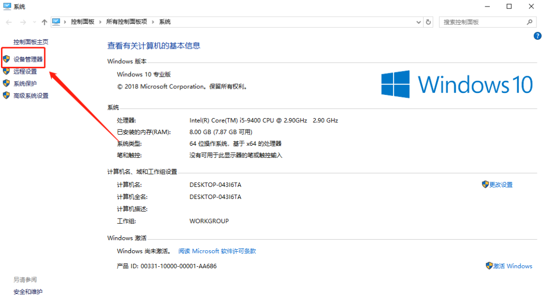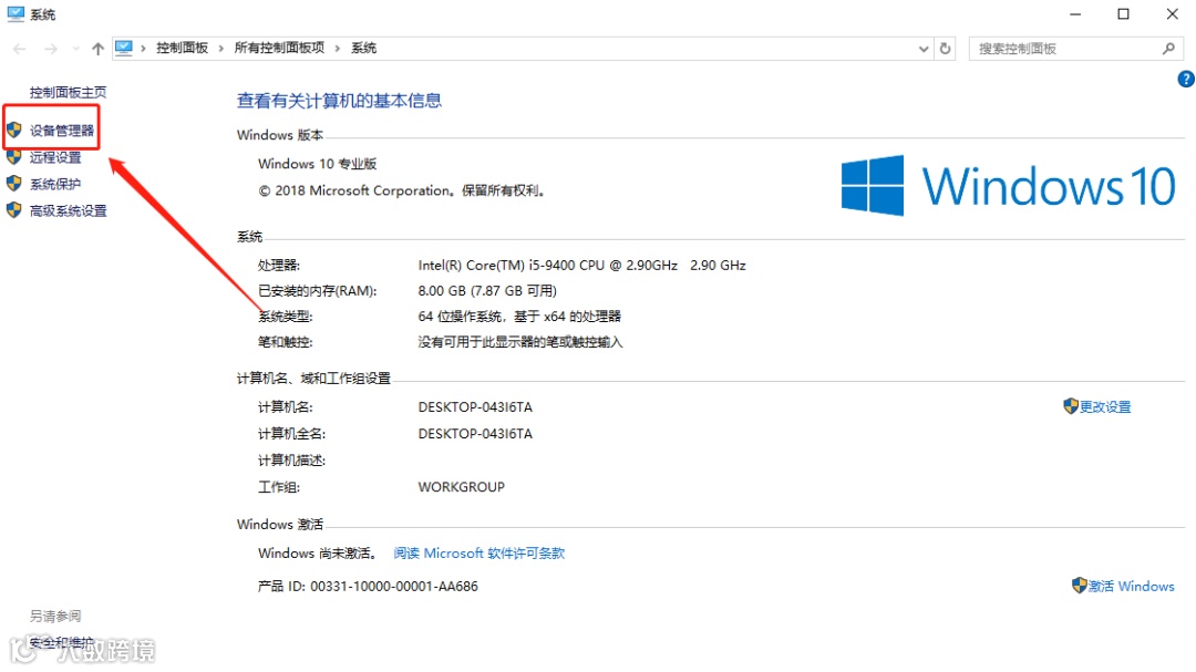 1.右键打开此电脑的【属性】窗口,点击【设备管理器】进入。