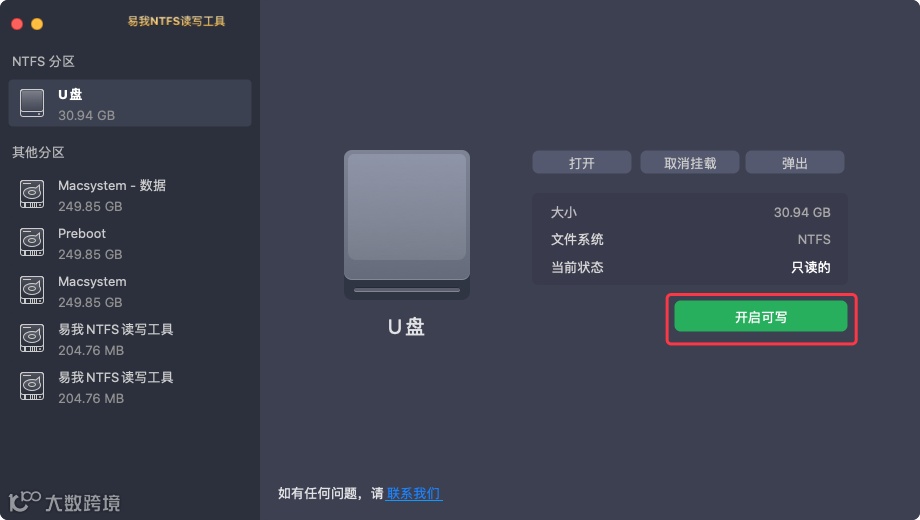 易我NTFS读写工具的界面简洁,操作起来比较简单,只需要将NTFS外置存储设备连接到电脑,软件便会进行自动检测,这时候点击【开启可写】便可以在Mac上读取、写入、复制、删除、编辑、传输NTFS外置存储设备上的文件。