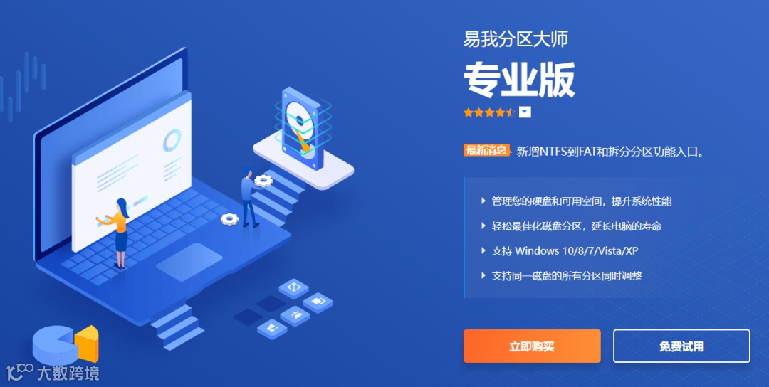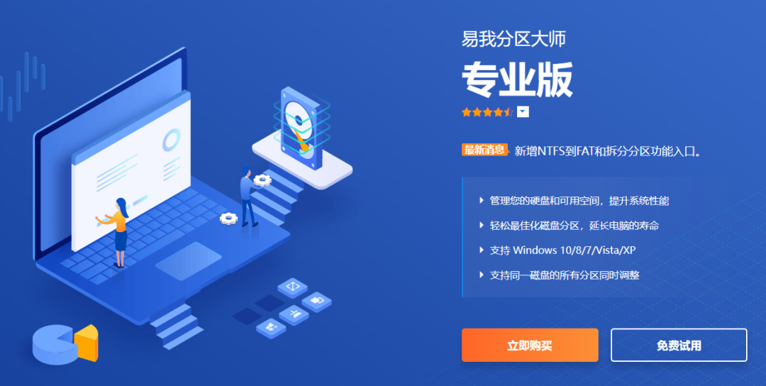 易我分区大师是一款专业的硬盘分区工具,支持创建/删除/格式化分区、拆分/合并分区、调整/移动分区、克隆分区;还支持不同分区格式的转换,如MBR和GPT格式转换、动态盘和基本盘转换、主分区和逻辑分区转换、FAT32和NTFS转换等;此外还能创建WinPE启动盘、还原丢失/删除分区、SSD 4K对齐、分区回滚保护等。最重要的是,在这些操作中,完全不会对数据造成影响,真正做到无损分区!