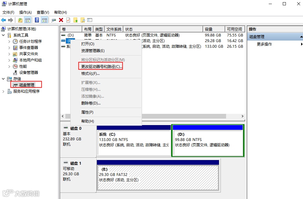 这个方法可以解决大部分U盘无法识别的问题,进入“计算机管理”,点击【存储】-【磁盘管理】,找到“可移动磁盘”并点击鼠标右键,选择【更改驱动器号和路径】;