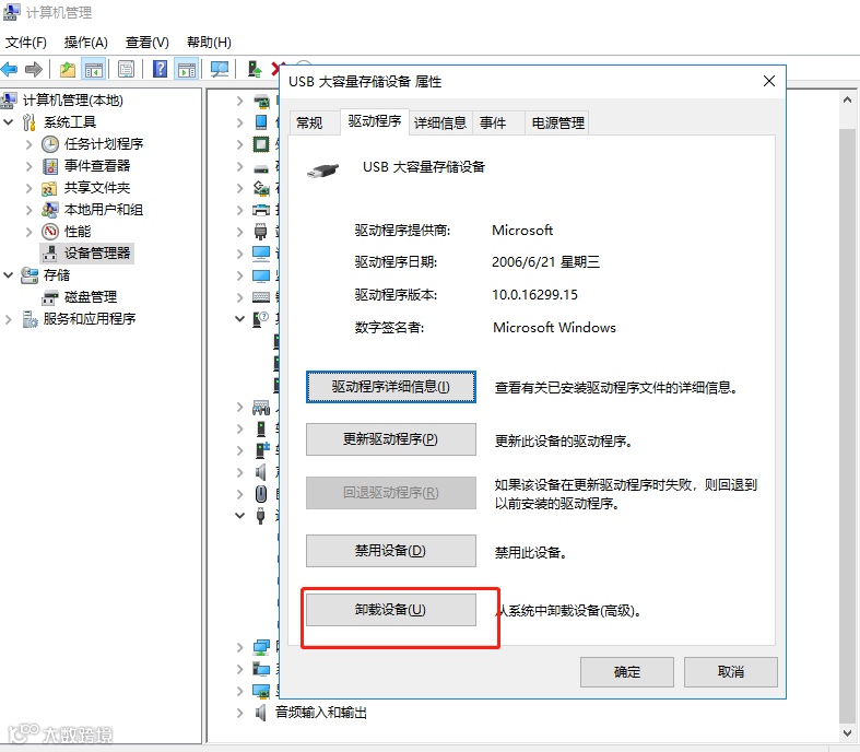 在弹出的窗口,点击【驱动程序】-【卸载设备】-【确定】,卸载完成后,将U盘重新插入电脑看是否能被识别。
