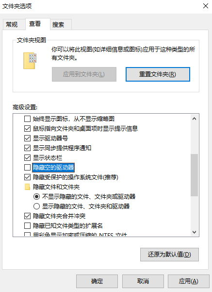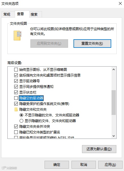 接着在【选项】界面下,选择【查看】,在“高级设置”下的“文件和文件夹”里,取消勾选“隐藏空的驱动器”,点击【应用】就可以了。