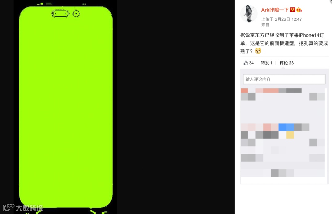 据微博用户@Ark咔嚓一下爆料称,京东方已经收到了苹果iPhone 14的订单,同时还附上据称是iPhone 14打孔屏幕图片,双打孔看起来就像是一个感叹号,与当前的安卓阵容单打孔方式有明显不同。