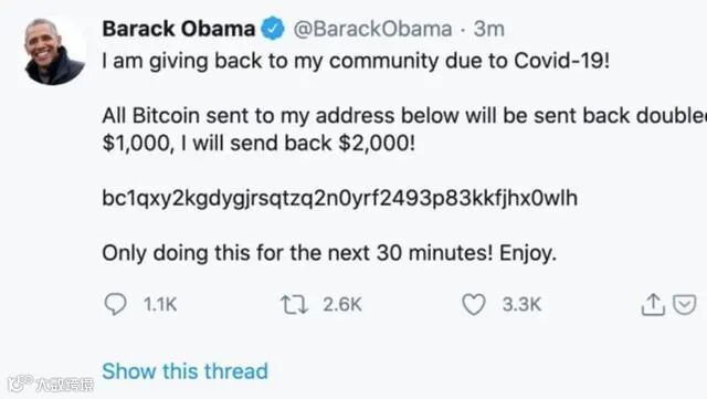 北京时间2020年7月16日凌晨三点左右,据福克斯新闻网报道,推特(Twitter)中大量热门的科技圈、政界要人、娱乐明星和加密货币交易所相关人士的账号被入侵。包括巴拉克·奥巴马(Barack Obama)、埃隆·马斯克(Elon Musk)、乔·拜登(Joe Biden)、比尔·盖茨(Bill Gates)等人在内的推特账号均遭到黑客攻击,这些被盗的账户全部都发布了如下的比特币钓鱼信息的推文。