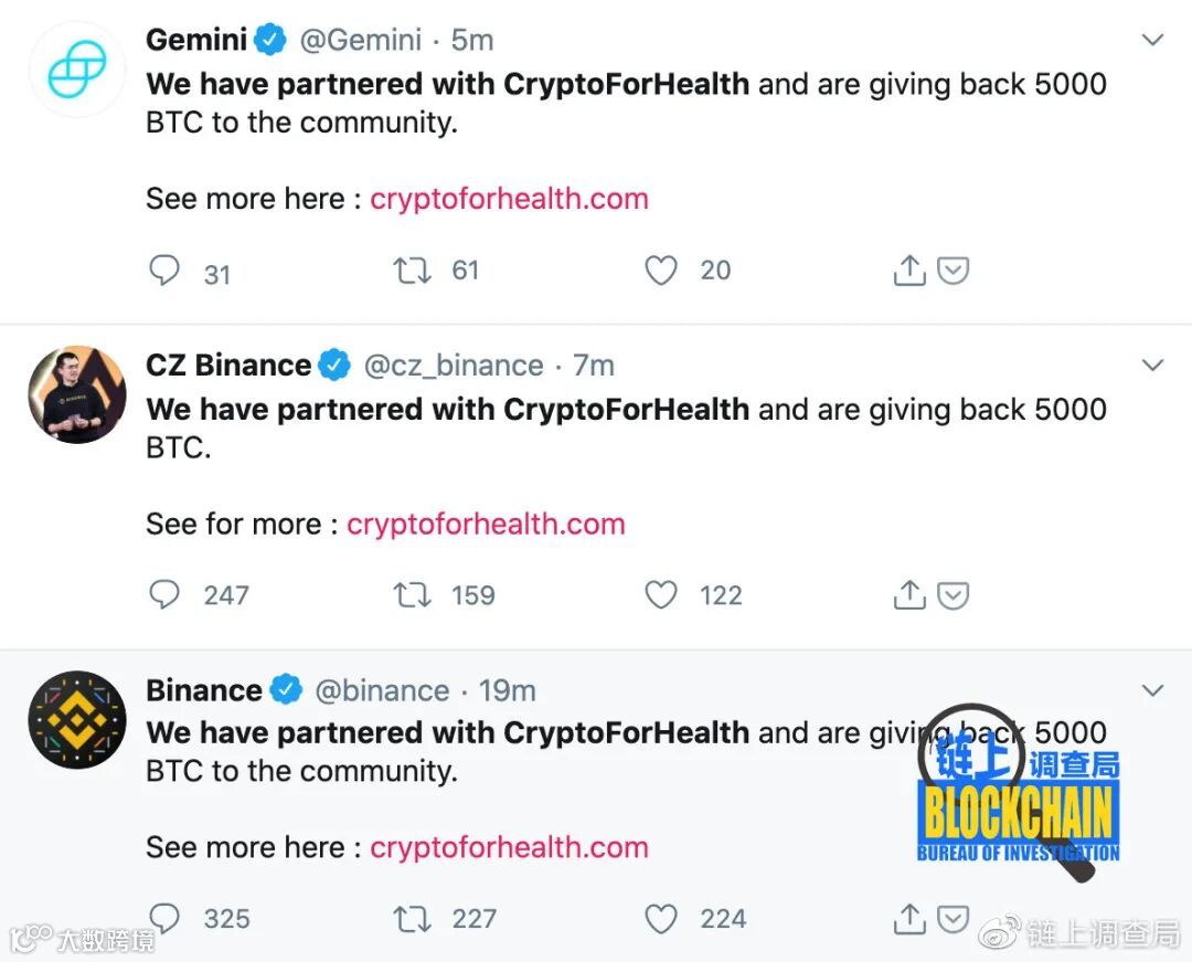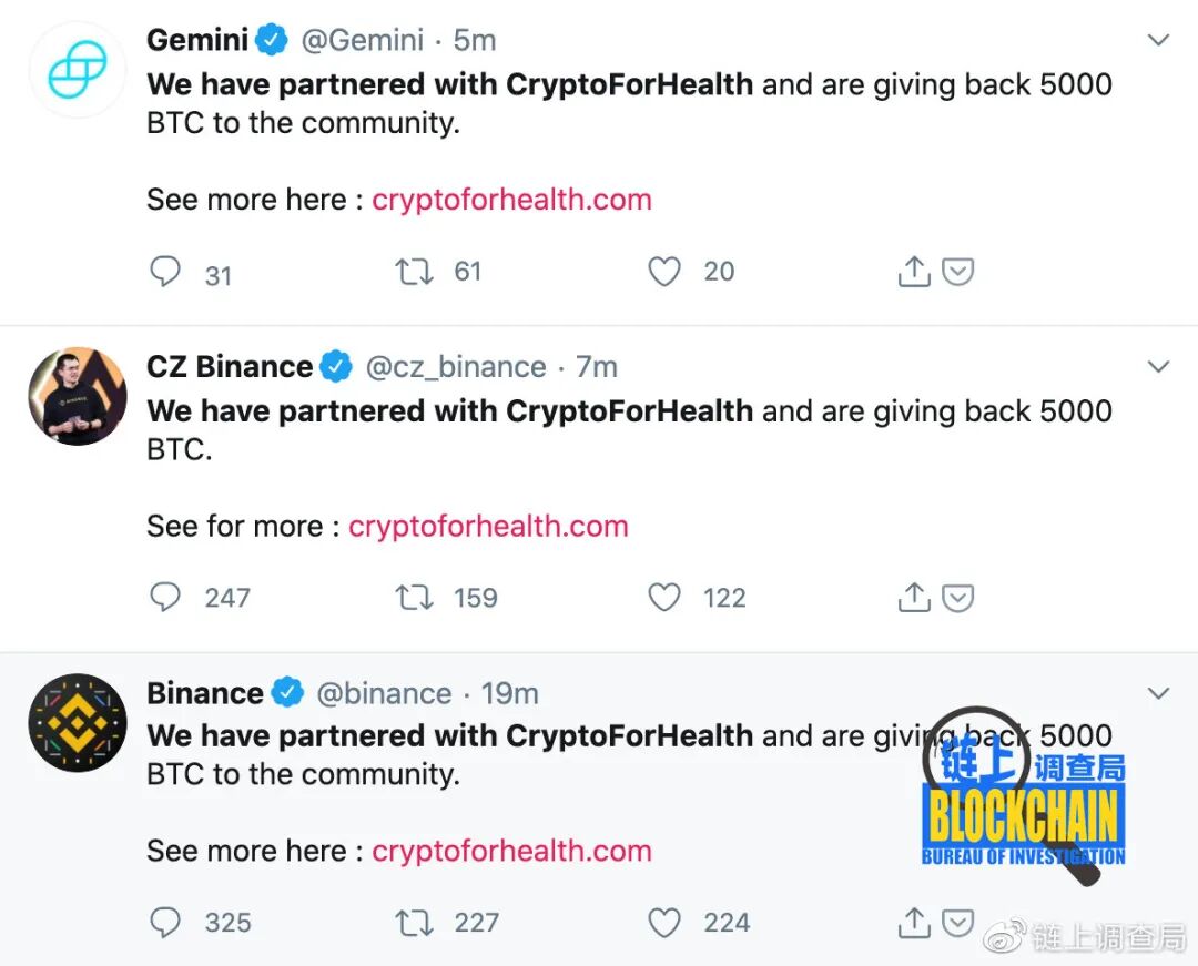 最早发现被入侵的账号是Binance币安及其CEO赵长鹏等加密货币领域的账号,在这些账号中,入侵者发布了“我们已经与CryptoForHealth合作,并回馈给社区5000BTC”这一段话,并留下一条链接地址。有消息称黑客可能通过这条钓鱼地址进行了更大范围的帐户入侵。