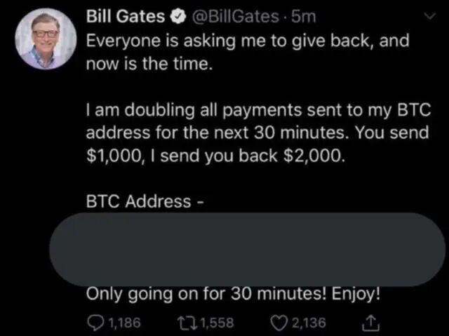 这些推特内容大同小异:“我在回馈社区。所有寄往以下地址的比特币将加倍退回!如果你寄1000美元,我就回寄2000美元。活动仅限半小时!”
