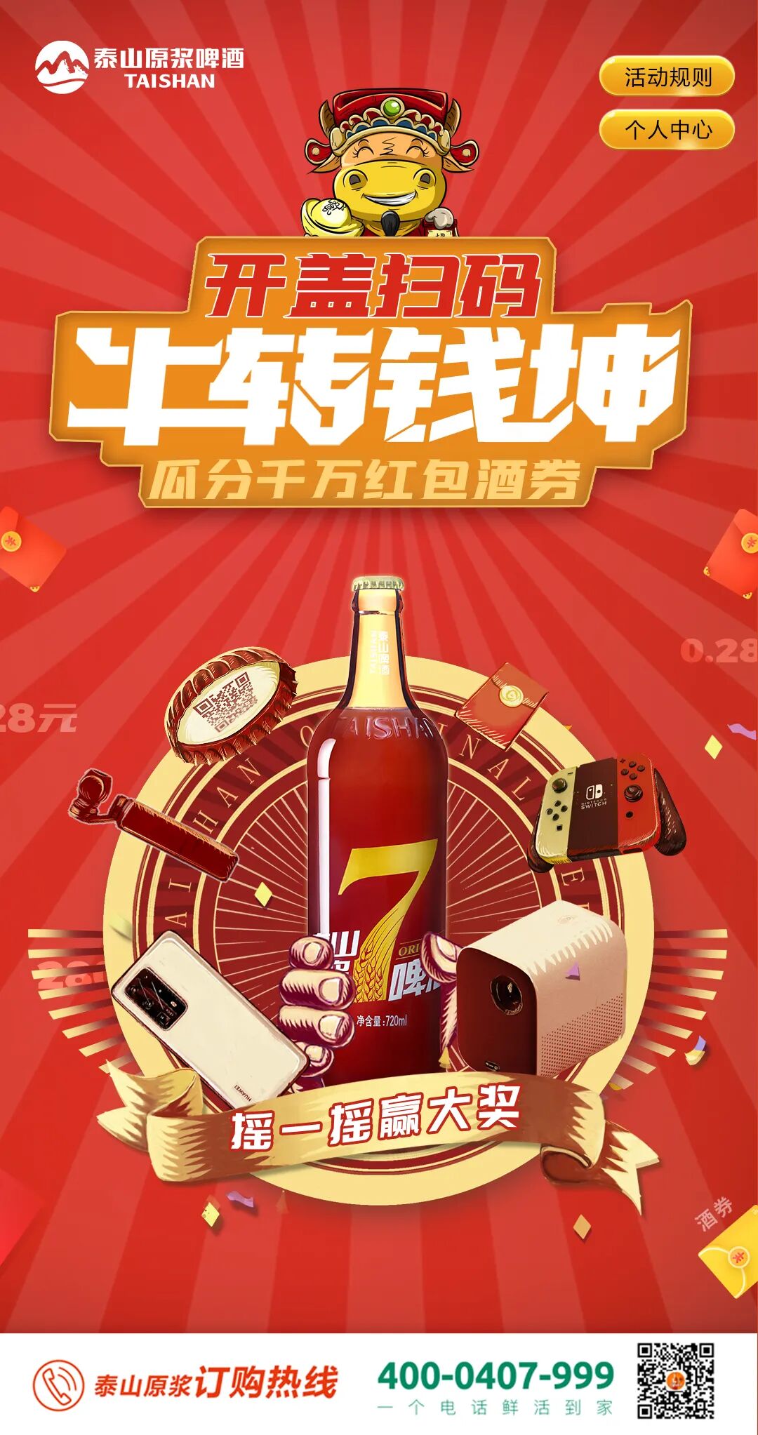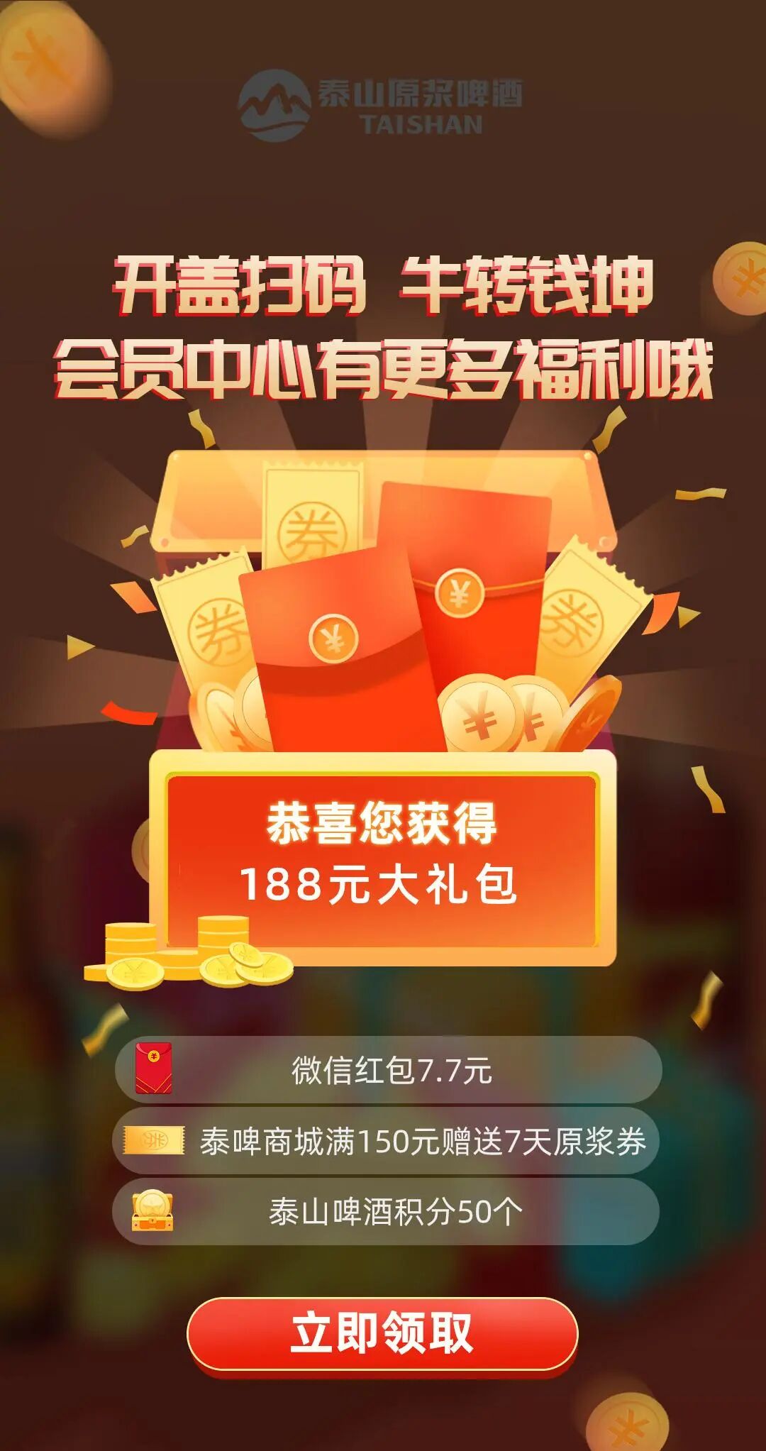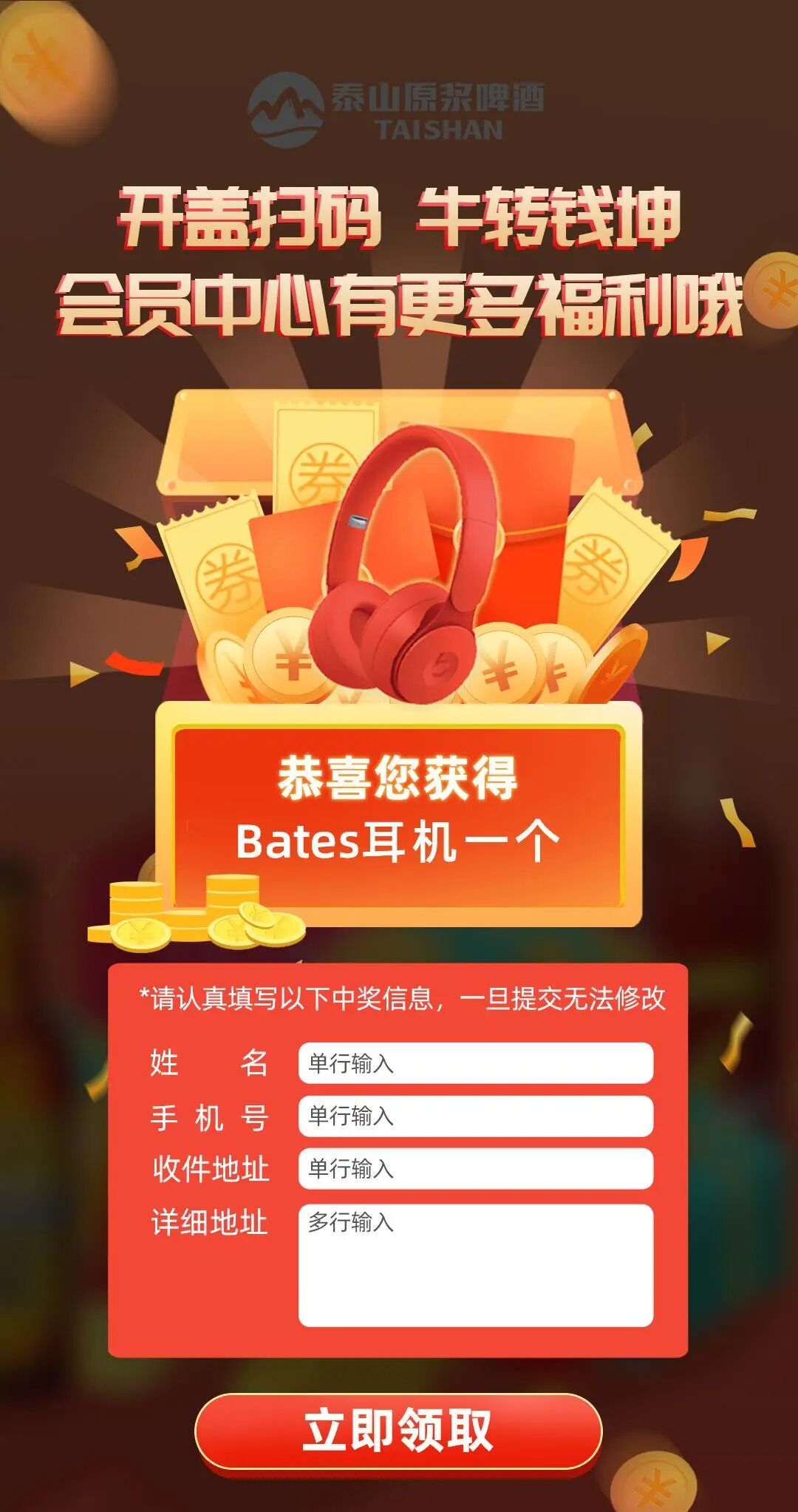 在活动上,泰山啤酒除了通过微信现金红包,实物大奖刺激消费者购买,还利用了优惠券,及到店领取的奖品,引导消费者进入线下门店,创造更多的销售机会。