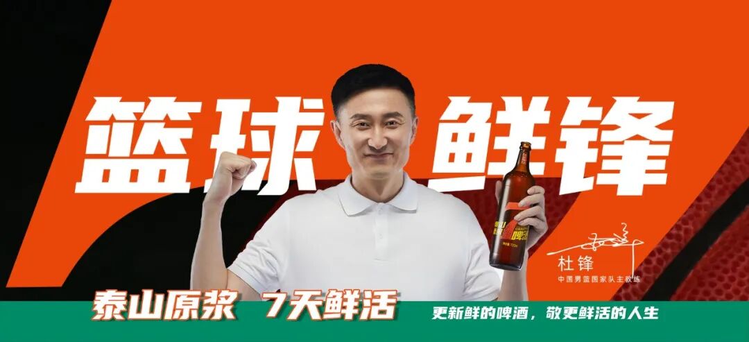 在品牌形象的树立上,泰山啤酒抓住了体育与啤酒之间的强关联性,邀请了CBA冠军巨头杜锋作为品牌代言人,杜锋作为冠军教头,不断争取胜利,精益求精的精神与品牌自身的精神相契合,通过明星代言的方式,传递品牌正能量,寻找认同,圈层粉丝。