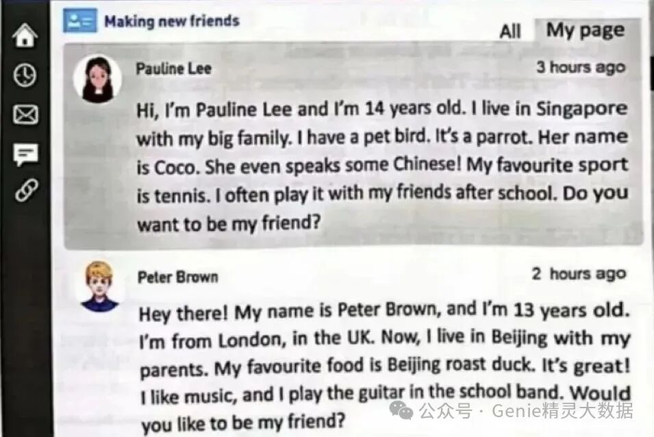 (3)选词组句可能用到的词语及中文解释:姓名(Name) 年龄(Age)住址(Address)学校班级(School Class)交友意愿(Willingness to Make Friends)兴趣爱好(Hobbies and Interests)