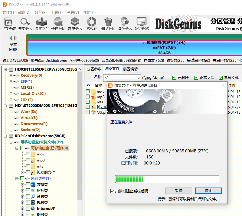 步骤三、点击“开始”按钮,软件会对内存卡进行快速扫描和深度扫描,寻找丢失的文件。