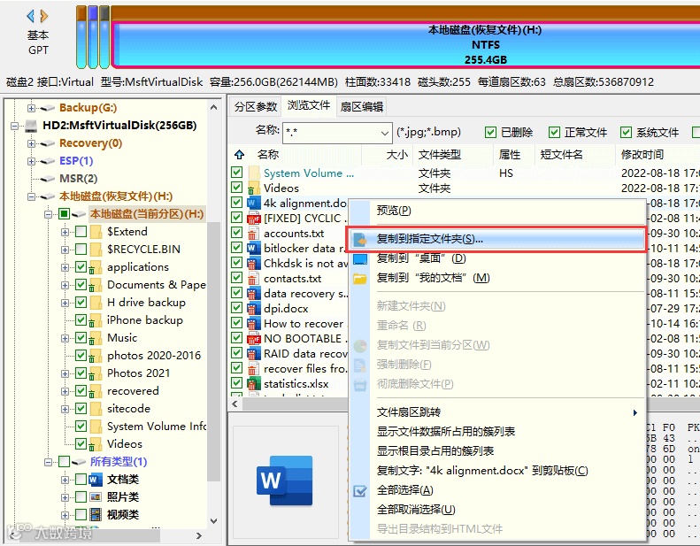 第四步、复制文件。在扫描结果中找到并勾选想要恢复的文件,右击鼠标,然后选择“复制到指定文件夹”菜单项。之后,为恢复的文件设置存放位置就可以开始复制文件了。