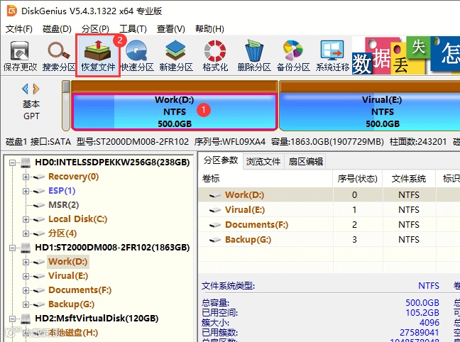 第一步:启动DiskGenius软件,在软件中找到需要恢复文件的硬盘分区。选中该分区,然后点击“恢复文件”按钮。