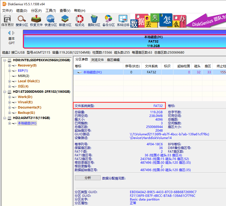 当我们需要将大于32GB的U盘、SD卡、移动硬盘等存储设备格式化为FAT32时,我们可以借助第三方的分区工具软件比如DiskGenius免费版来进行格式化。除了FAT32,DiskGenius免费版还支持将U盘格式化为exFAT、NTFS、ETX4、EXT3、EXT2等格式。需要注意的是,在格式化之前,要先把U盘里的重要数据备份到其他地方,因为格式化会清除所有数据。下面是将大容量U盘格式化成FAT32格式的具体步骤。