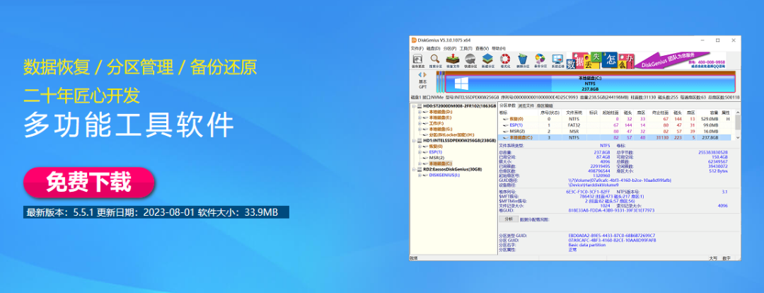 DiskGenius是一款非常好用的数据恢复软件,可以帮你找回丢失的照片、视频、文档等数据。对于清空回收站、使用Shift+Delete永久删除、误格式化、分区打不开提示格式化、分区丢失、病毒破坏等造成的数据丢失,均提供数据恢复支持。即便是系统崩溃的情况,也可以使用DiskGenius制作WinPE启动盘,然后恢复数据。