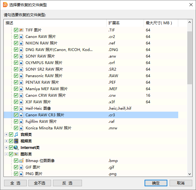 提醒:在开始搜索之前,可以点击"额外扫描已知文件类型"按钮,打开如下图所示的窗口。在这里,可以为深度扫描指定文件类型,例如CR3照片文件。通过深度扫描找到的数据会放到扫描结果中的"所有类型"部分。通过这种方式找的数据会按照文件类型分类,没有原始的文件名,但是这里会列出更多需要的数据,尤其是当原始的文件目录结构受损严重的时候。
