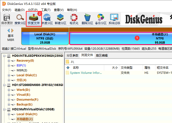 第二步:打开DiskGenius数据恢复软件免费试用版之后,选中丢失数据的分区,然后点击"恢复文件"按钮。