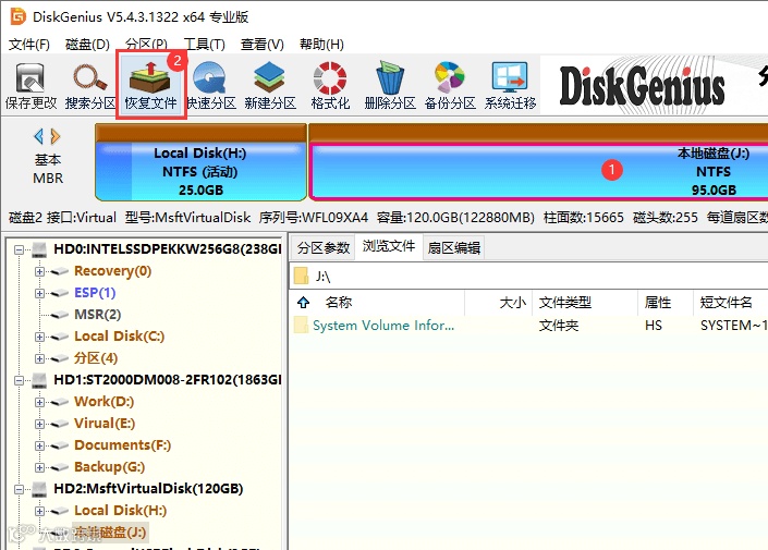 第二步:使用"恢复文件"功能对丢失数据的分区进行完整扫描。选中已删除照片所在的分区,然后点击"恢复文件"按钮。