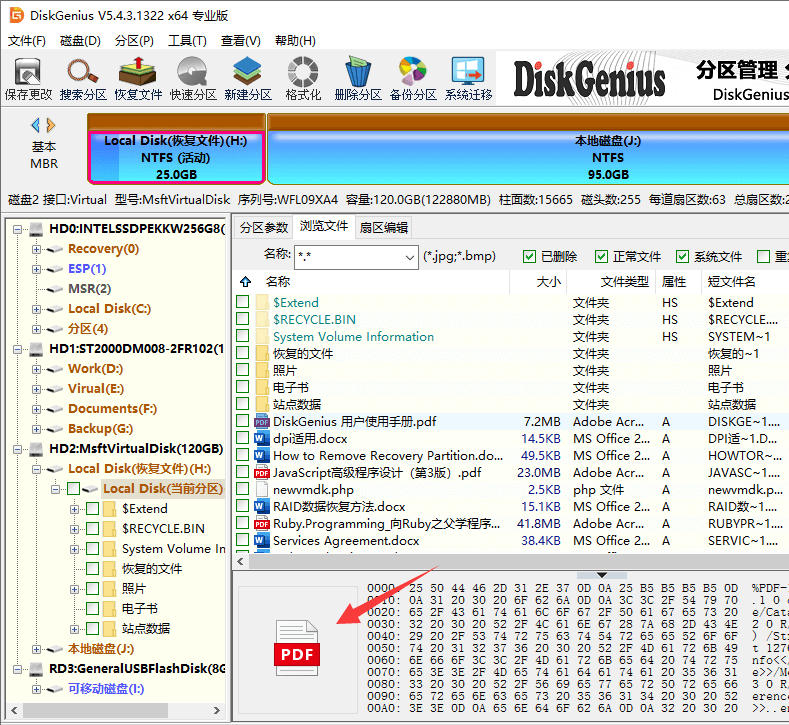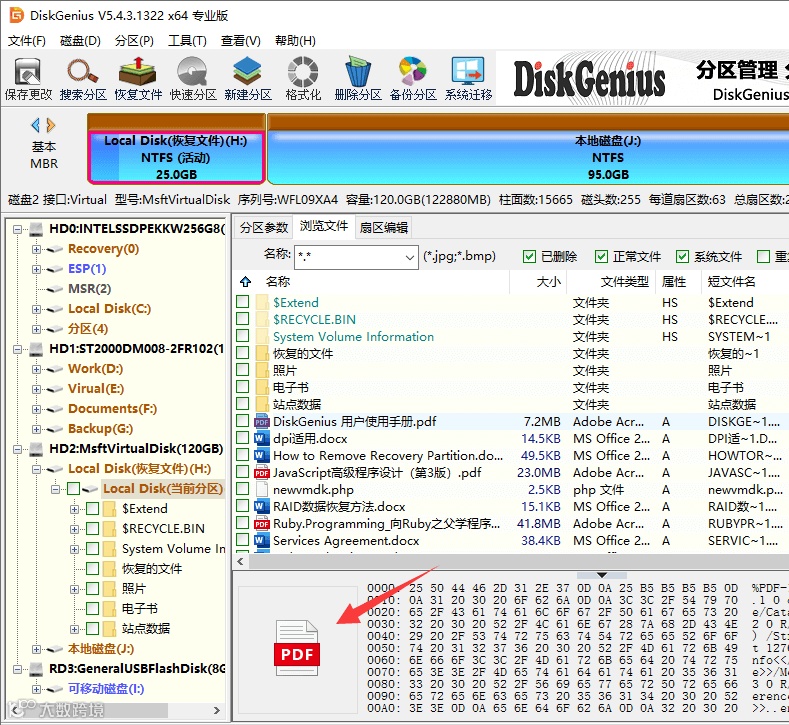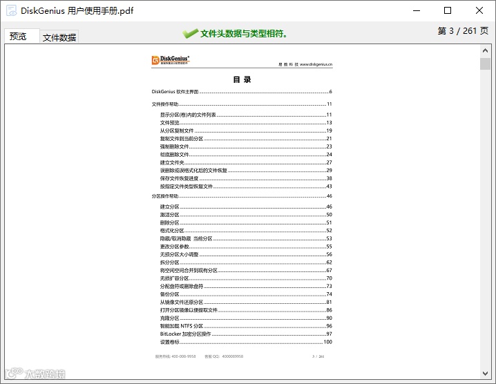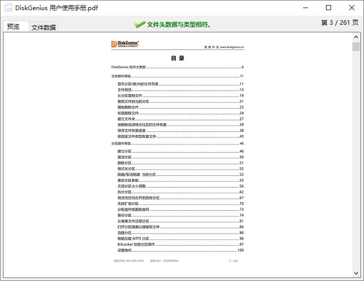 现在PDF文件的使用越来越普及,DiskGenius完美支持PDF格式文件的预览,操作方式与Office文档的预览几乎相同。