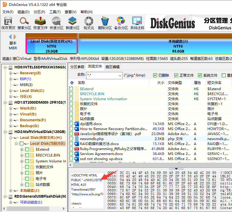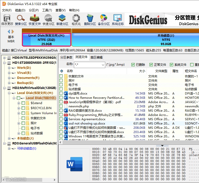 下图是在DiskGenius扫描结果中,选择一个Word文档后的软件截图: