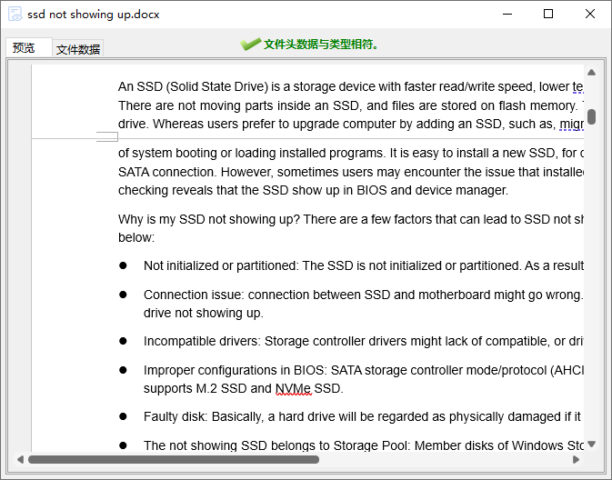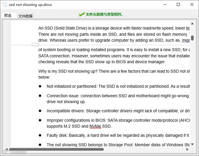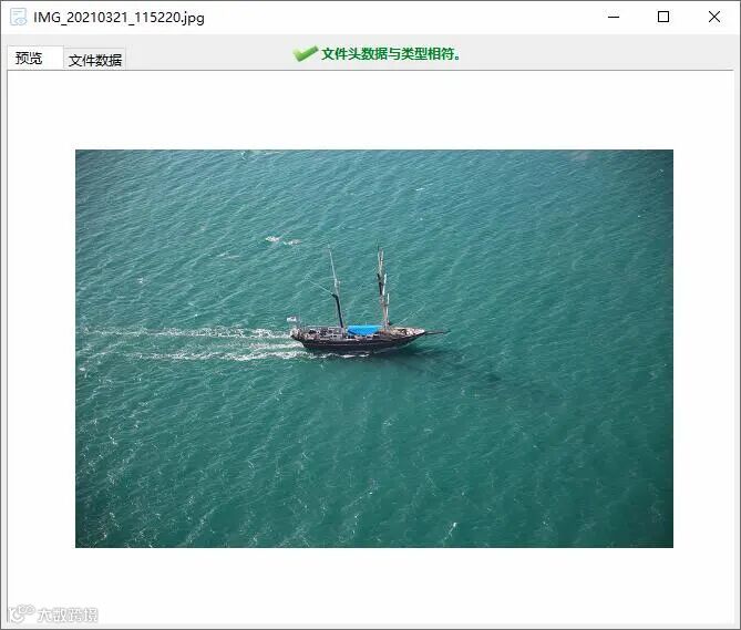 首先,在预览窗口上部,DiskGenius会显示该文件的文件头是否与文件类型相符,如果相符的话,说明该文件,至少文件头没有损坏,有可能会被正确恢复出来。