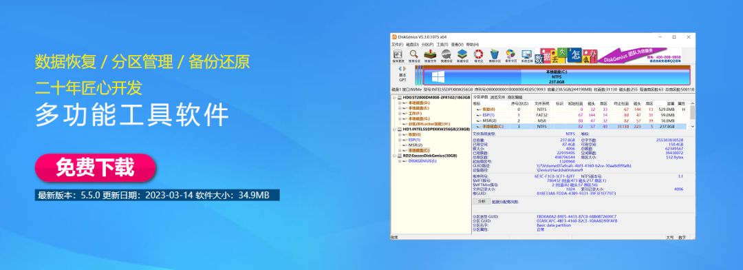 想要恢复丢失的分区,首先要寻找一款好用的丢失分区数据恢复软件,很多数据恢复软件都支持文件恢复,但是很少有软件可以直接搜索已丢失的分区。这里小编推荐一款好用的分区数据恢复软件 – DiskGenius数据恢复及分区管理软件。