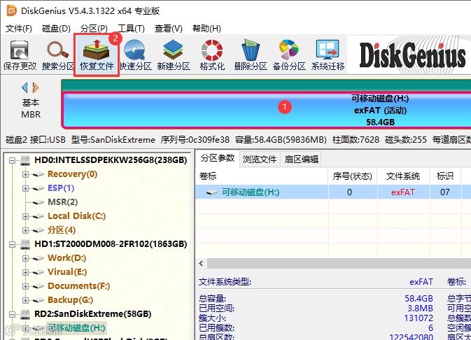 第一步:打开DiskGenius软件,在软件主界面选中需要恢复数据的U盘,然后点击"恢复文件"按钮。