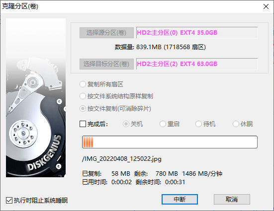 将Ext4/3/2分区所在磁盘克隆到其他磁盘。支持从大硬盘克隆到小硬盘、支持克隆树莓派SD卡。