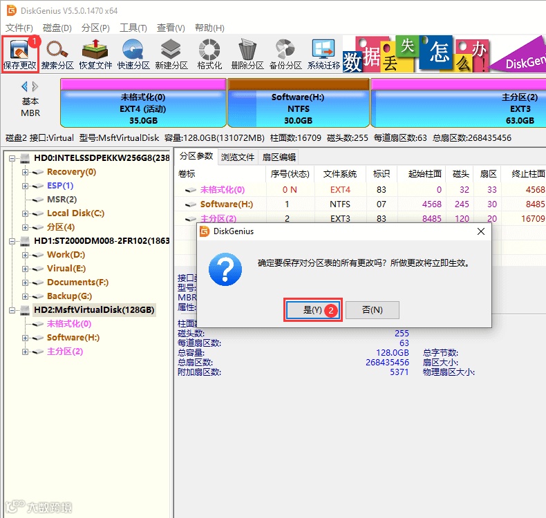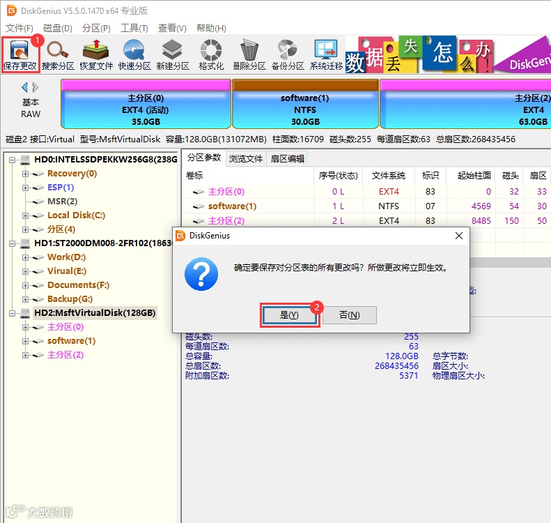 保存分区表:点击“保存更改”按钮,然后在弹出的对话框上点击“是”。