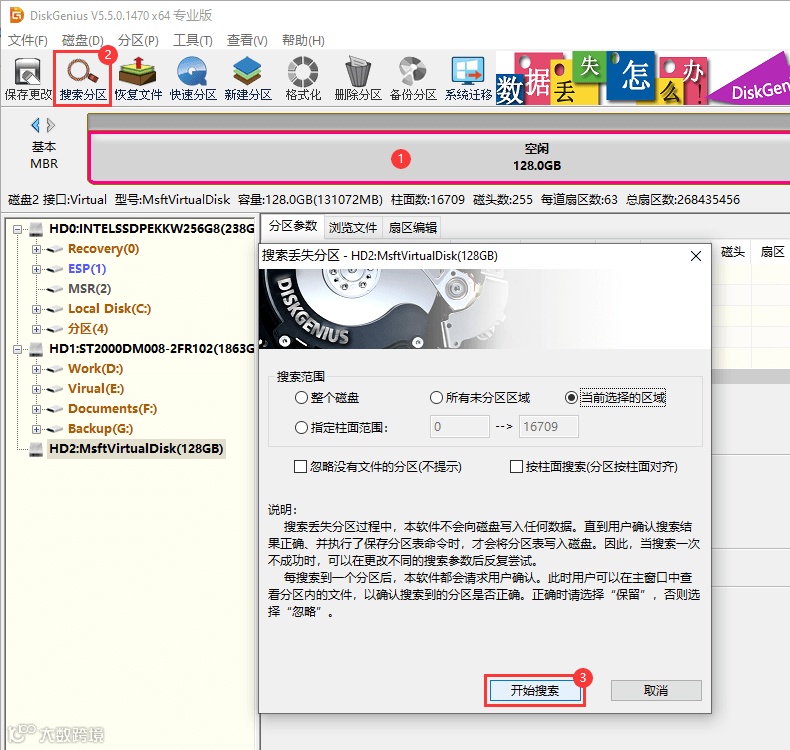 第一步、启动DiskGenius专业版,选中需要恢复丢失分区的硬盘,点击“搜索分区”,然后点击“开始搜索”按钮。
