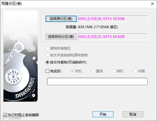 第三步、确定没问题后,点击“开始”按钮。由于目标分区和原分区大小不一致,克隆方式只能选“按文件复制”。