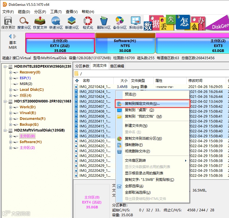 除了读取Ext4分区里的文件,DiskGenius还支持导出文件,将文件复制保存到其他分区或硬盘。