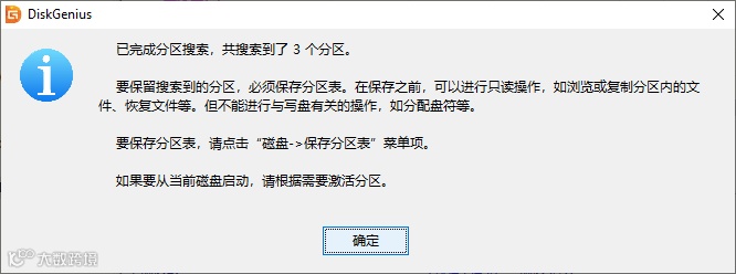 提醒:这里被“保留”的分区,只是暂时存在内存中,并没有写入磁盘,不会对磁盘数据造成任何影响。想要真正恢复这些分区及分区里的数据,需要等分区搜索结束后保存分区表或是将数据复制到其他硬盘。