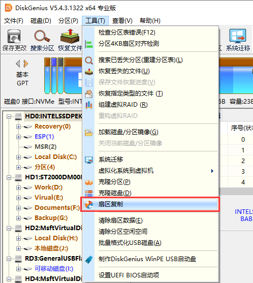 第一步:点击“工具”菜单项,然后选择“扇区复制”功能。