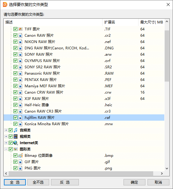 如果想专门对RAF格式的照片进行深度搜索,可以点击“选择文件类型”按钮来自定义需要进行额外搜索的文件类型,如下图所示。