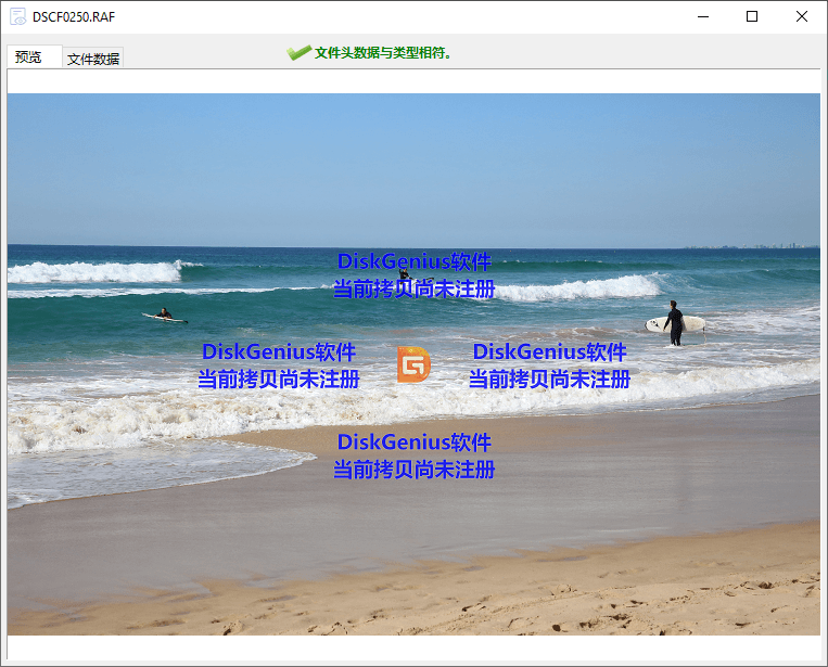 第四步:预览丢失的照片。双击右侧窗口的文件就可以打开预览窗口并查看文件原始内容。DiskGenius软件支持RAF格式图片的预览,可以帮助用户轻松预判文件是否可以被正确恢复。