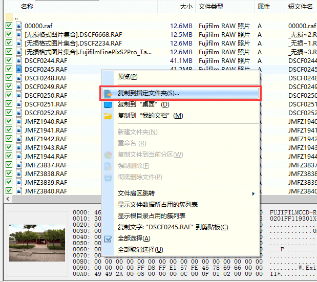 第五步:将需要恢复的照片复制到其他分区或硬盘。勾选想要恢复的文件,右击鼠标并选择“复制到指定文件夹”菜单项,然后将文件保存到其他分区或硬盘即可。
