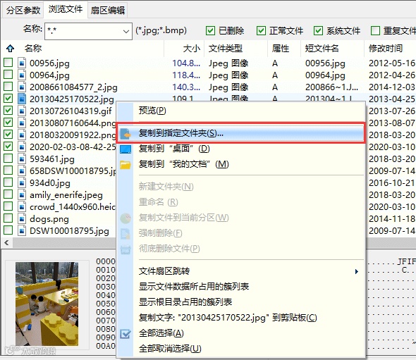 第三步:勾选想要恢复的照片等文件,点击鼠标右键并选择“复制到指定文件夹”菜单项,把需要恢复的照片复制保存到其他分区或硬盘。