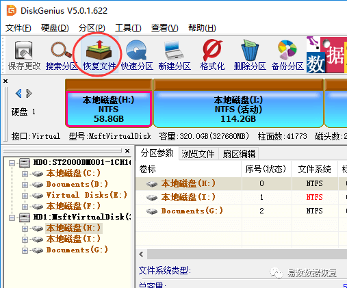 第一步:打开软件,选中丢失数据的分区,然后点击 恢复文件 按钮,如下图所示: