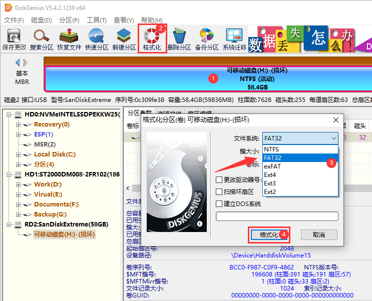 RAW格式说明文件系统损坏了,无法被Window识别。这样一来,SD卡上的数据也就无法访问了。如何修复RAW?方法很简单,格式化一下即可。如果SD卡没有物理损坏,格式化之后就可以正常使用了。但是,如果SD卡里的数据十分重要,格式化之前需要先恢复数据。对于RAW格式的SD卡,推荐使用DiskGenius来恢复数据。软件可以对SD卡进行完整深度扫描,尽可能多的找回丢失的照片、视频、音频等数据。恢复数据过程对SD卡执行只读操作,不会破坏原始数据。SD卡数据恢复的操作流程非常简单,具体步骤如下: